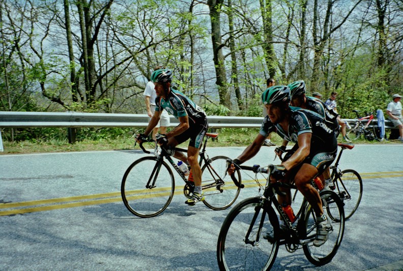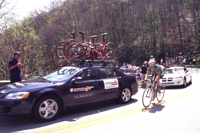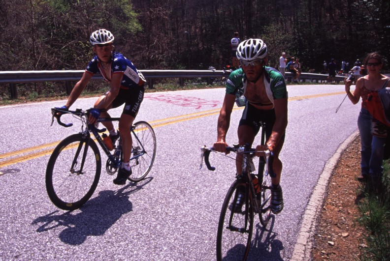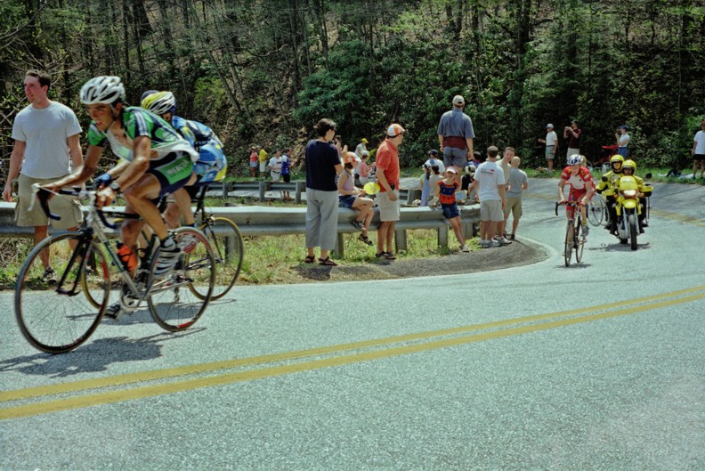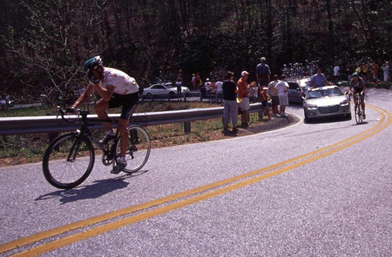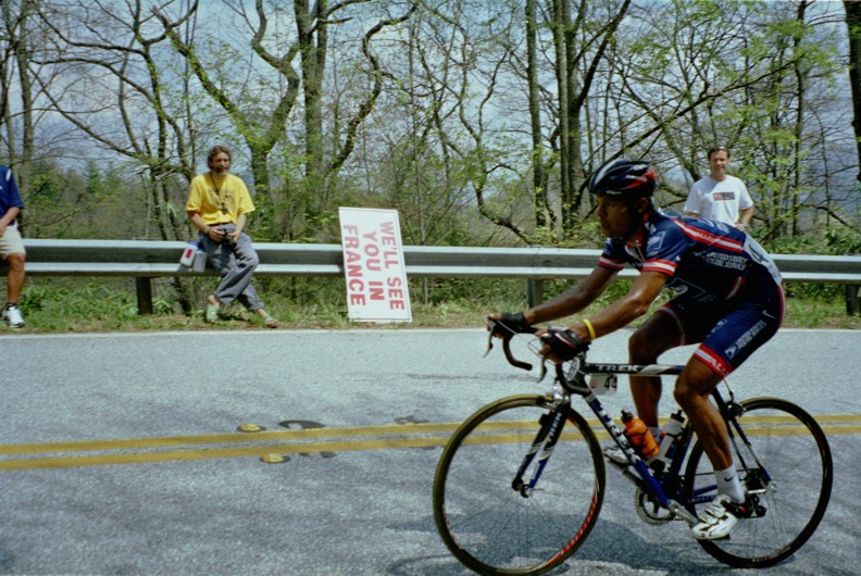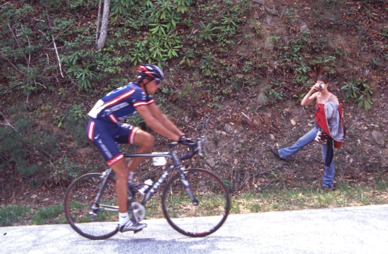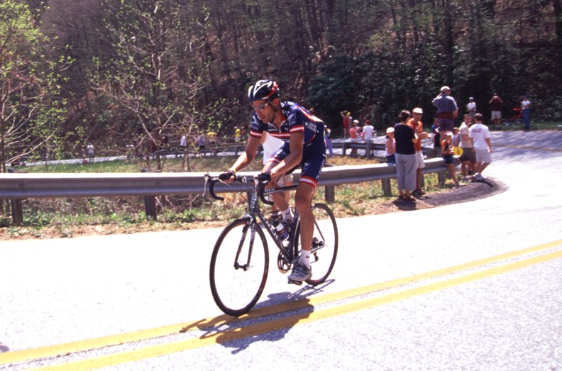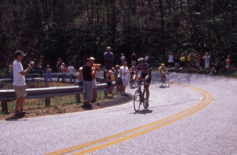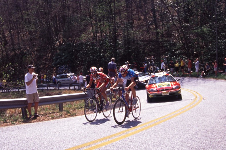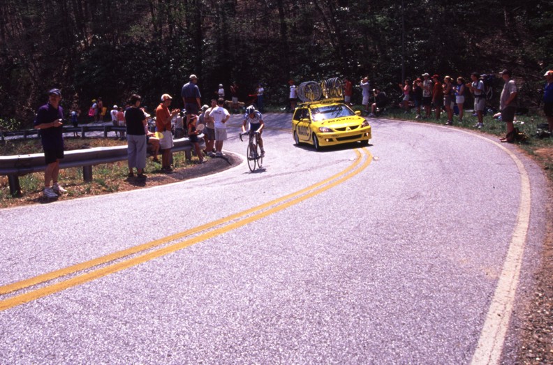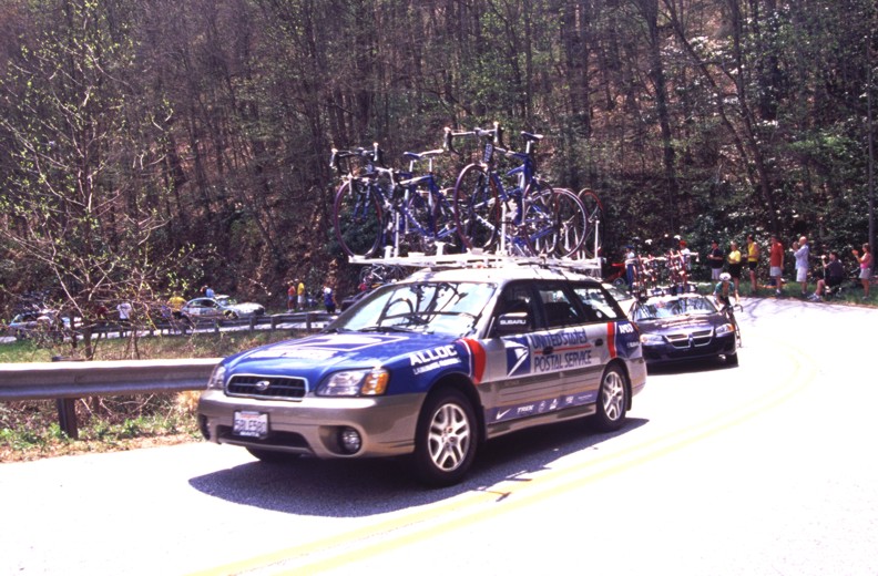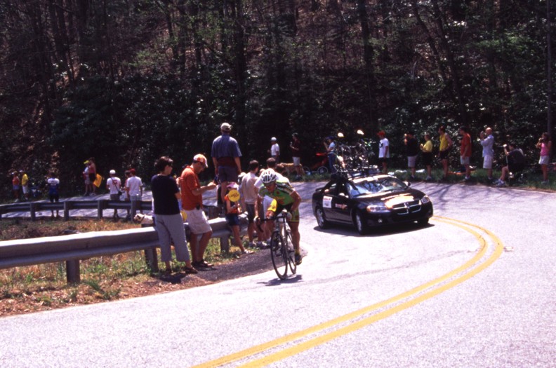 George Hincappie previewed this climb for the Postal team, its only two hours drive from his front door, and told the team that they would need 23 tooth rear cassettes for the climb. Most of the other teams had not previewed the climb and underestimated their needs. The majority had 21's on the back and when they realized that Postal was equipped with 23's there was a mad scramble to get 23's early that morning. A contact of ours that was working neutral support said they had to refuse to give away any of their 23's in order to keep enough to do their job. On this final climb it was rumored that several riders were flatting on purpose in hopes to get one of the rear wheels with a 23. Because of improper gear selection many of the riders suffered more than they should have.