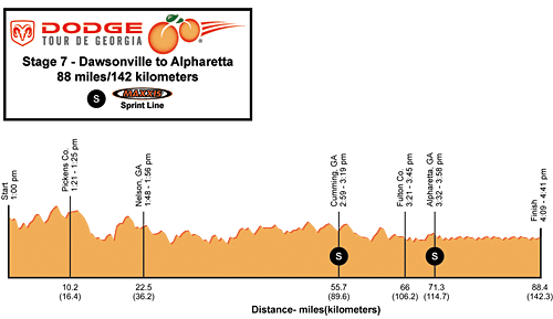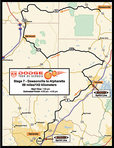 When the riders got to the finish in Alpharetta it was a battle for the sprinters. Domina Vacanze set up to lead out Mario Cipollini who had his sights set on winning this stage. Juan Jose Haedo was hot on Chipo's wheel with Gordon Fraser sitting close on his rear. As they neared the finish Chipo was eating as much road as he could to keep anyone from passing him but Juan and Gordon found a hole and blasted through with Gordon inching out Juan for the stage win.