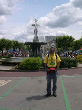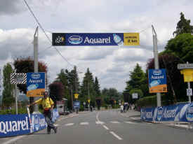 Stage 9 from Saint-Leonard-de-Noblat to Gueret was our first stage of the 2004 Le Tour de France. After a long drive from Paris the day before, we arrived in Gueret late to find only one restaurant still open. We soon discovered that in most small towns in France everything closes early except the bars. We ate a good vegetarian pizza which turned out to be our only meal eaten in a restaurant on the entire trip. We slept that night in a parking lot at about the 4 kilometer to go line on the stage 9 course. We woke up early and found a grocery store to stock up on supplies for the next few days. After fixing breakfast and a picnic lunch we wandered off to follow the course and find the finish line.