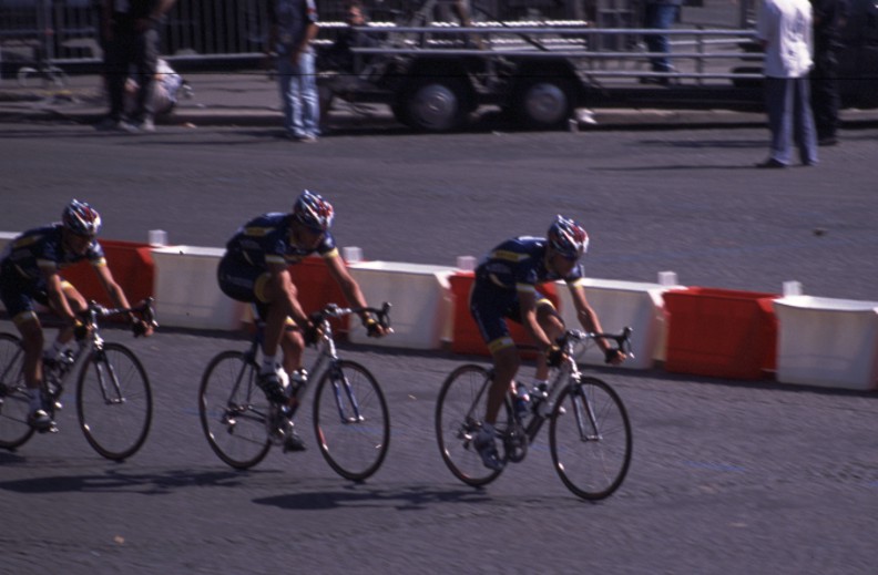 When the riders hit the Champs the leaders team is allowed to ride at the front of the peloton for the first lap. Lance let U.S. Postal lead him out and he sat last wheel showing the fans how much respect he has for his team. After that lap Postal went into a defensive position and let the other teams battle it out for the win. I can't imagine what it is like to fight it out over the cobblestones at full speed. The fact that the bikes hold together is a testament to the quality of the team mechanics.