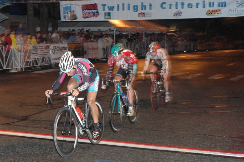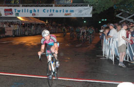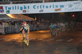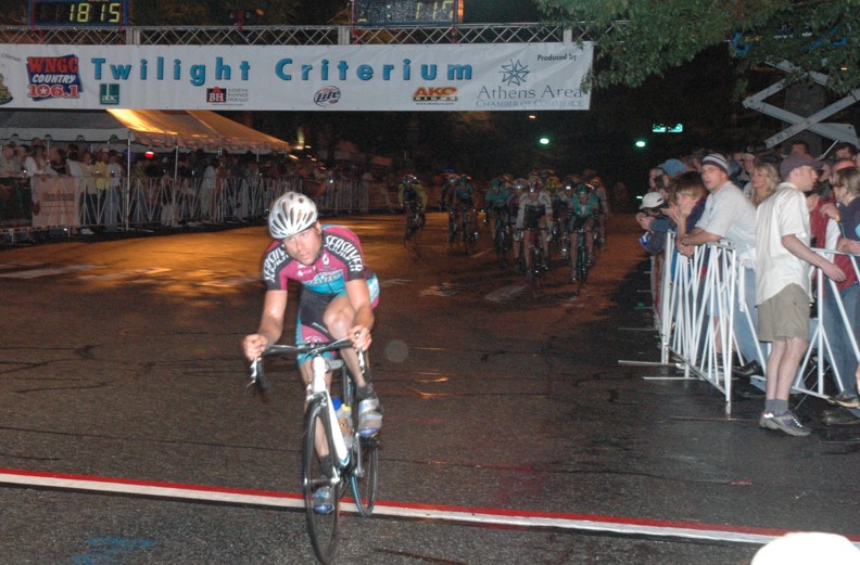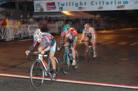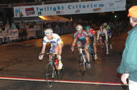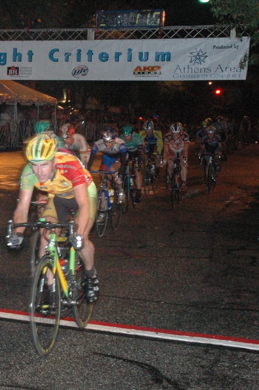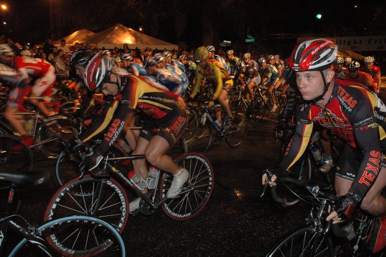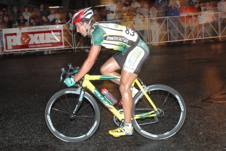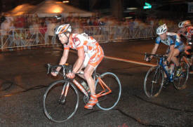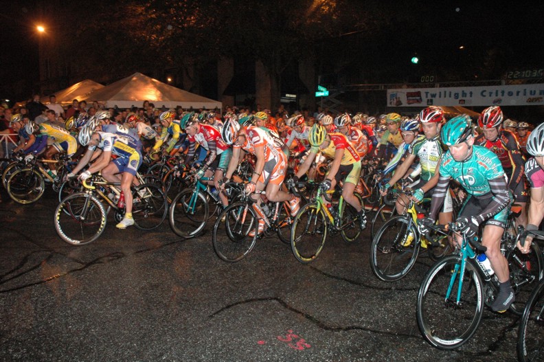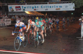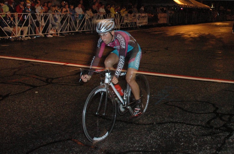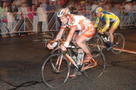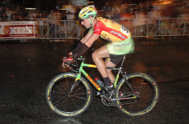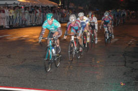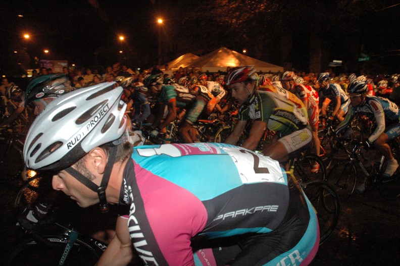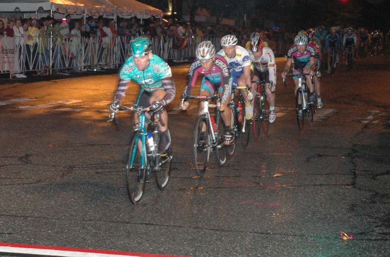 The men's race did not start until 10:00 p.m. The heaviest of the rain had passed but there were still a few light sprinkles that continued through most of this event. The rain did stop before the finish but the roads remained very wet. There was much fanfare as the racers were introduced.