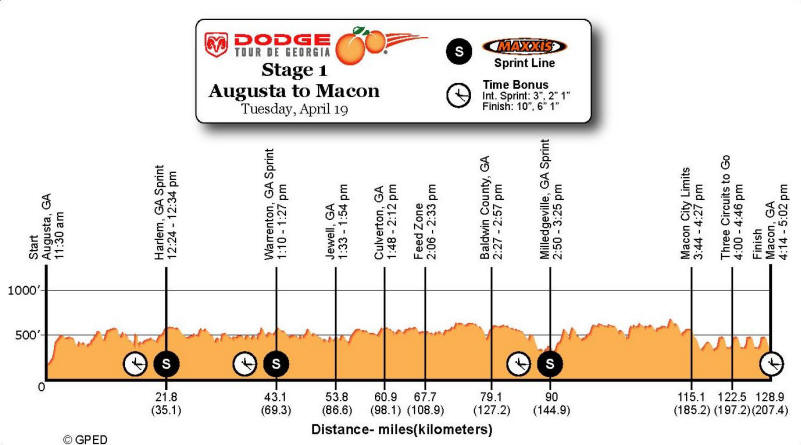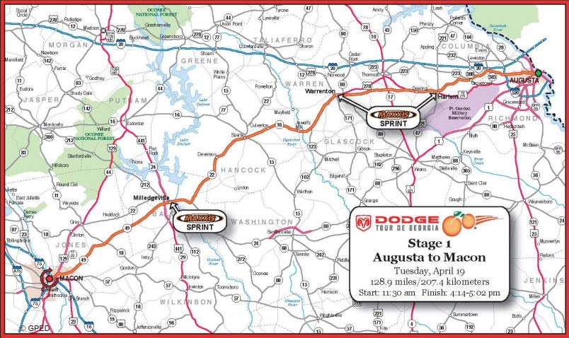 This stage covers approximately 129 miles and finishes in Macon. This is the third year that Macon has hosted a stage. Macon is a nice city which is close enough to Atlanta to be convienent and still retains a good deal of old Southern Charm. There are lots of historic places to visit here and it is quite popular for conventions. It has hosted the Georgia State Gideons convention on multiple occasions and will again next year.