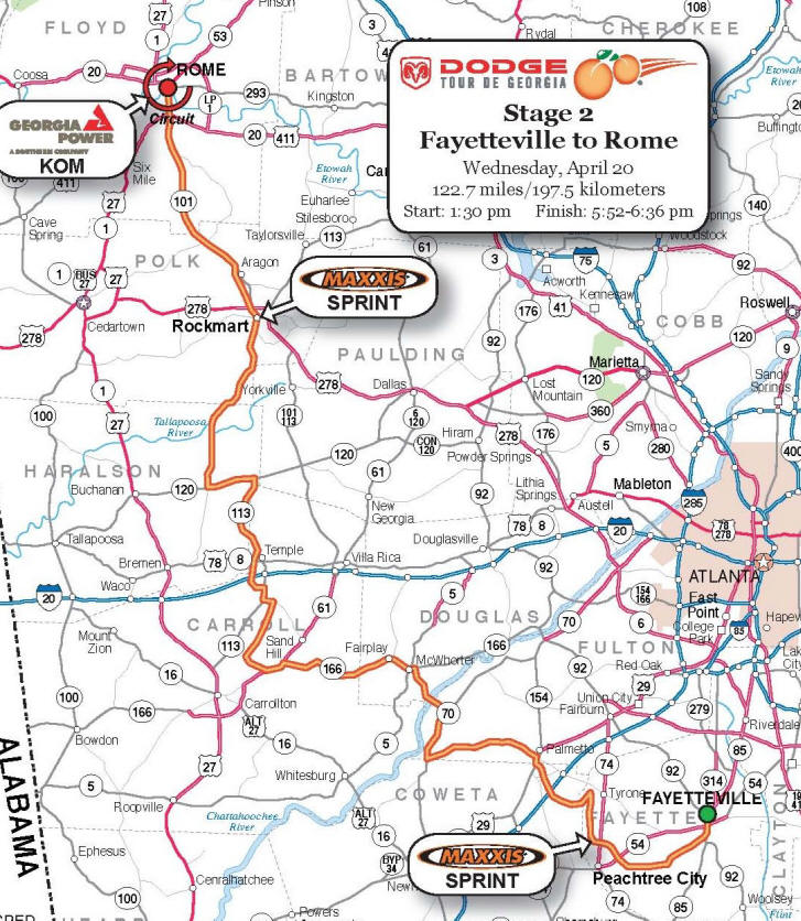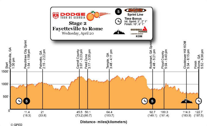 Stage 2 begins in Fayetteville just south of Atlanta. This is the start to see for those urbanites that live in Georgia's version of a concrete jungle. This stage is approximately 123 miles long and covers rolling terrain that will again favor the sprinters. With the final 25 miles trending mostly downhill look for the riders to be coming in fast and rested for a great final sprint.