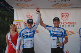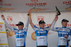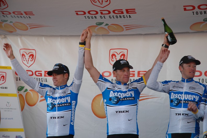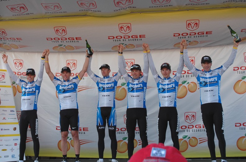 The Discovery Team won the team event portion of this years Tour de Georgia. They dominated and controlled almost every aspect of the race. The only stage that they seemed weak on was surprisingly the time trial stage in which they usually take no prisoners. My belief is that they didn't feel it was worth taking any chances in the rain and just kicked back and took it easy. They played their tactics well and surprised everyone by sending Tom to the front on stage 5. Lance rode very well but this was not his race. Folks need to remember that there is only one race that matters to him this year.