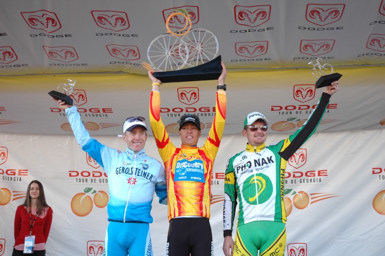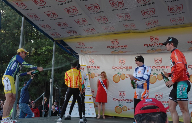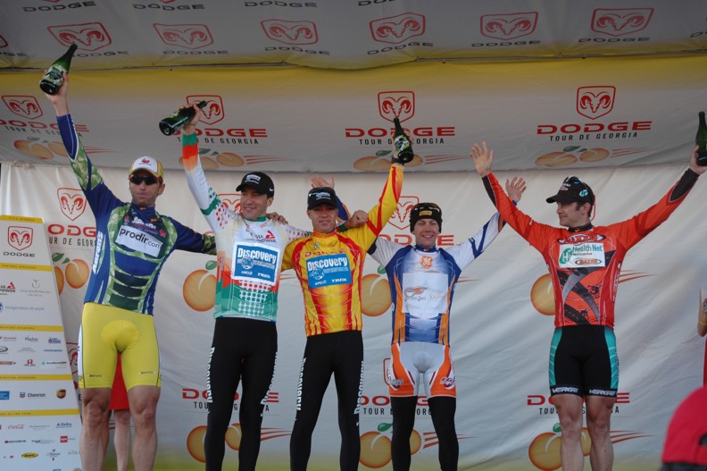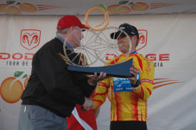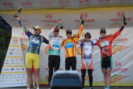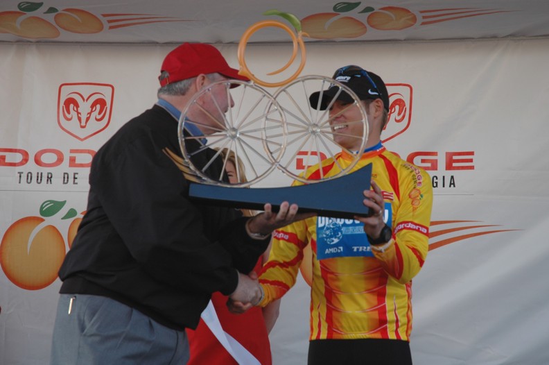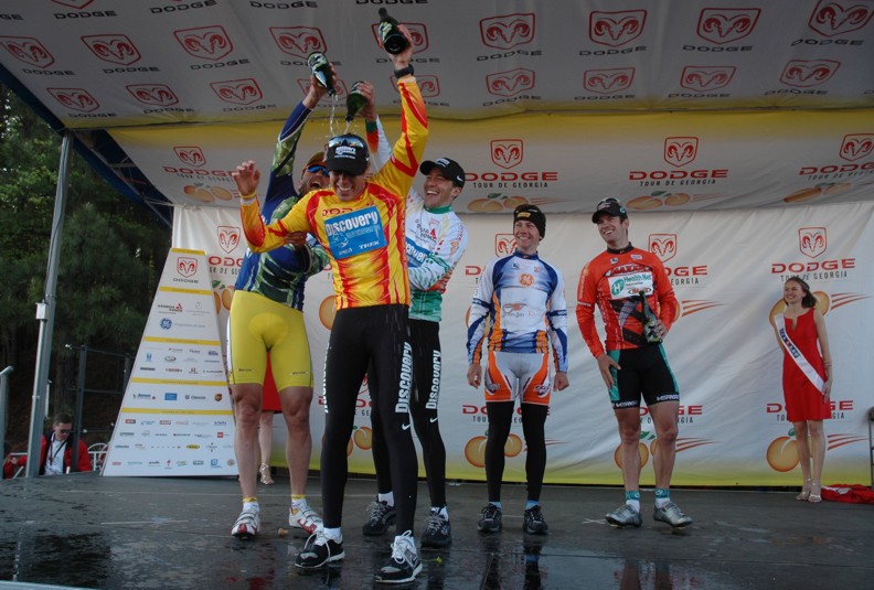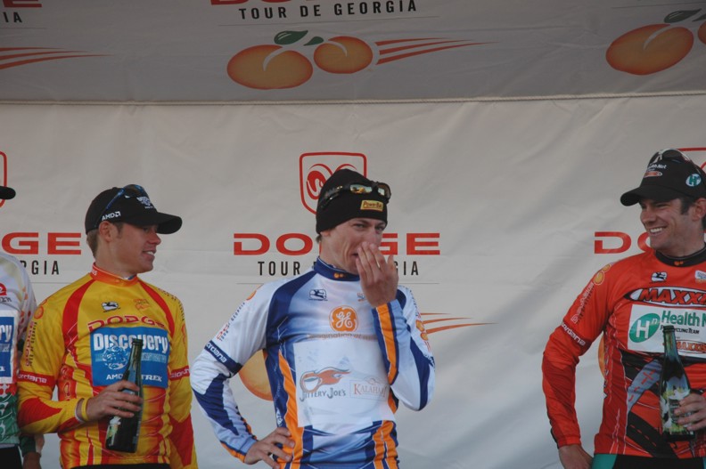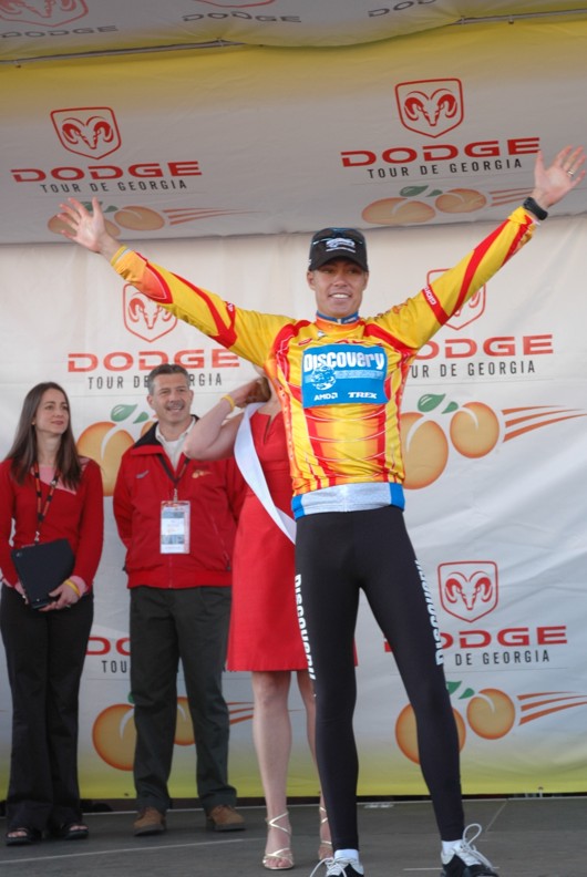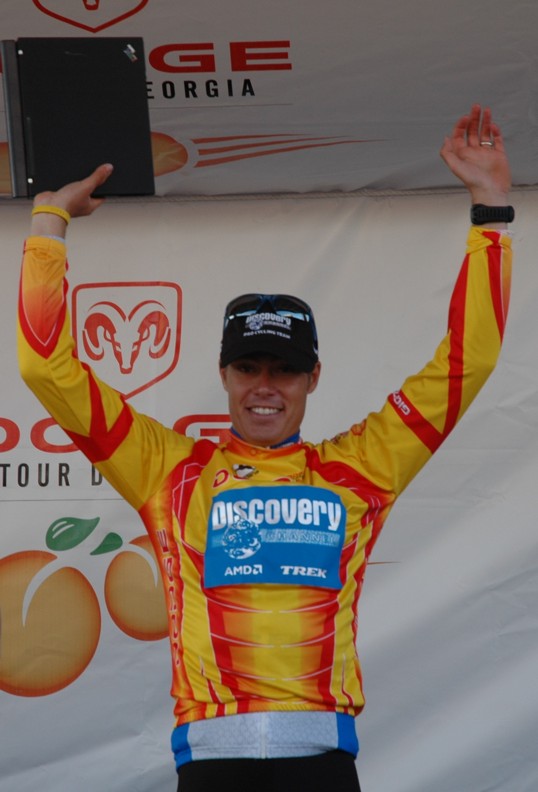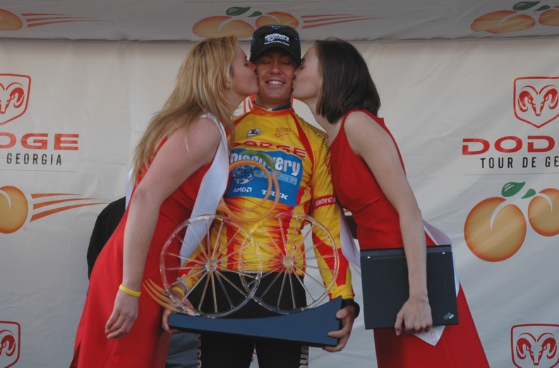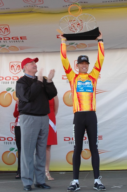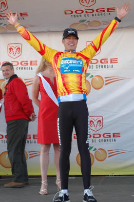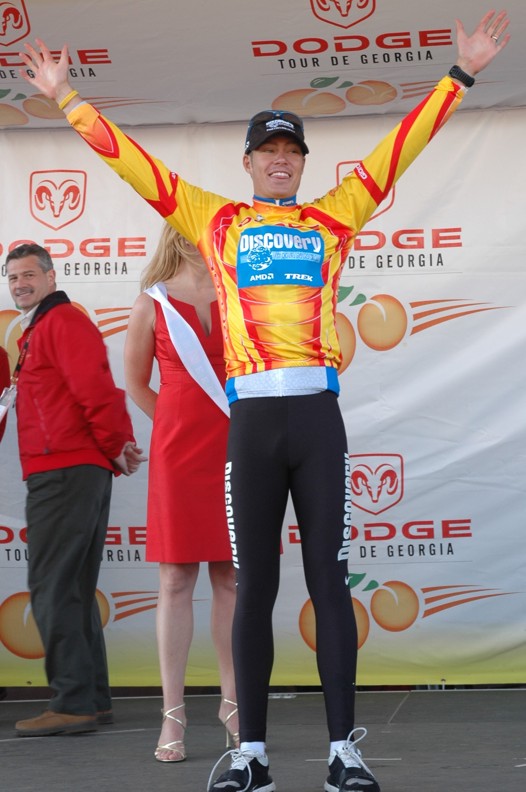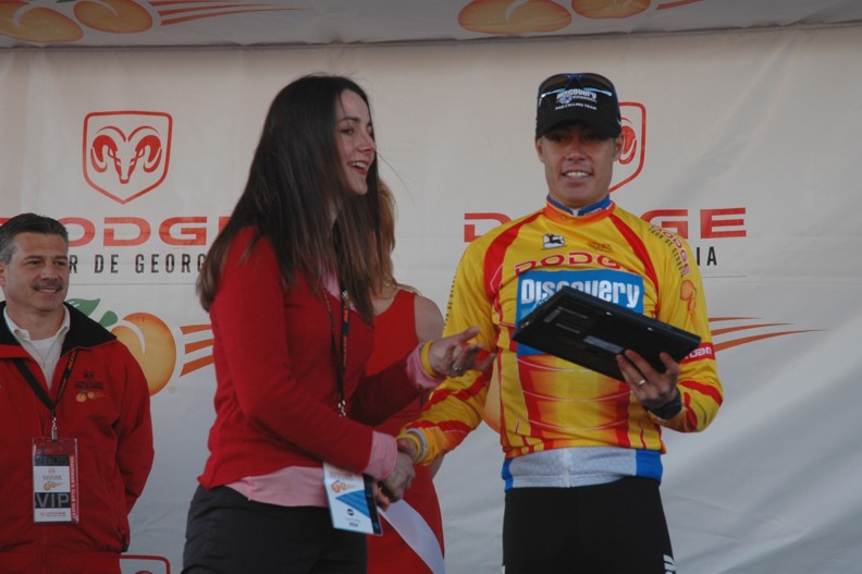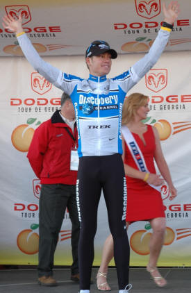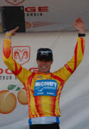 Tom finally took the podium for the presentation of the yellow race winners jersey and trophy. I.B.M. also presented him with his second think pad of the week. The question is, does he give it to his "better half", Lance or does he just keep it for himself? I'll see if I can get to the bottom of this important cycling question. I believe that this is a site we will become accustomed to seeing, Tom Danielson taking race wins for the Discovery Team. He seems happy and I am sure the franchise is happy to have such a talented young rider.