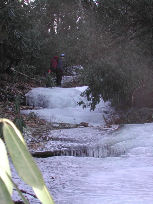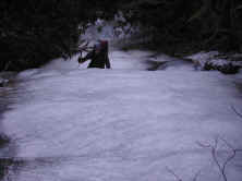 This route is an obvious drainage that virtually every ice climber crosses on a regular basis. I won't say exactly where it is but most should figure it out from the photos. The center pitch is a known popular climb. most folks just don't go all the way to the bottom or the top. There is a fair amount of bushwhacking involved and some flat frozen creek crawling but it all combines into a very long alpine gully climb that makes a wonderful exit from another seldom climbed Whitesides jewel.