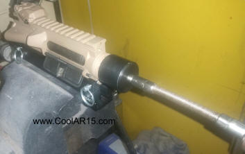 Below is the tool with flexible shaft installed and engaged with surface of upper. As the front of the upper is being squared the shaft is also removing any high spots inside the receiver which allows the bolt to mesh better with new upper and less chance of any bolt binding during break in period.