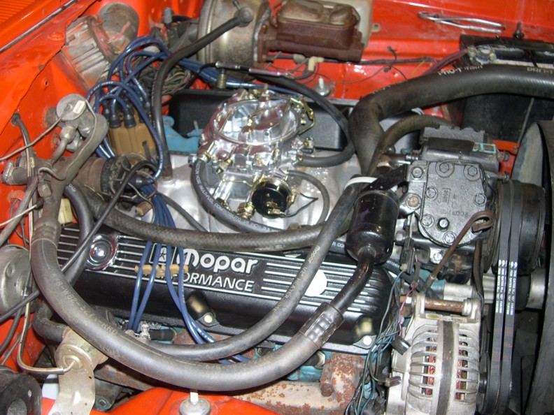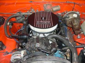 I have been through a good portion of the engine and as far as I can tell it is in near 100% condition. It now sports a Edelbrock aluminum, high rise, dual-plane intake manifold. The "Performer" manifold is topped off with a Edelbrock 600 c.f.m. four barrel carburetor with an electric choke. The air is filtered through a Mopar cast aluminum air cleaner and Mopar cast aluminum valve covers finish dressing up the top of the engine. I have also added a Melling high flow oil pump as an excuse to inspect the bottom end of the motor. This is all fired by a Mopar electronic ignition for reliable sparks.