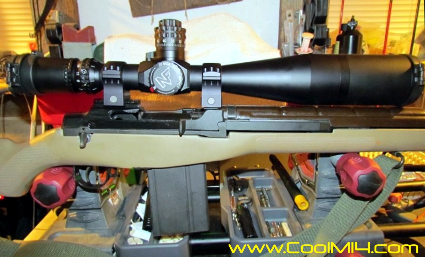 Rifle is a Bula Defense Systems XM21 with all Bula parts including trigger group, gas cylinder, stamped spring guide, except for SEI Vortex muzzle brake using Bula Ultra Heavy 22" 1:10 National Match barrel and Hawk's kit. Action is now bedded in a USGI fiberglass stock. Scope is a NightForce Beast on ARMs #22 quick detatch rings.
