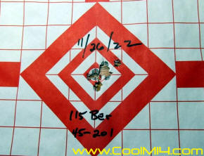Breaking in the barrel on Bula XM21 #209 that I just put together recently. Took the scope off and removed the action for more clearance work in the ferule area. This is a USGI figerglass stock so we can't expect much accuracy. Not bedded yet but pretty tight at any rate. Target 1 is cold clean bore after sticking the scope back on. 1.5 moa to the right with elevation pretty good. 2 is second 10 rnd group with a bit of over correction. Targets 3 and 4 was making scope as adjustment. 5 is the final 10 rnd group of the 50 rnds fired today. Target six was shot a couple days later.