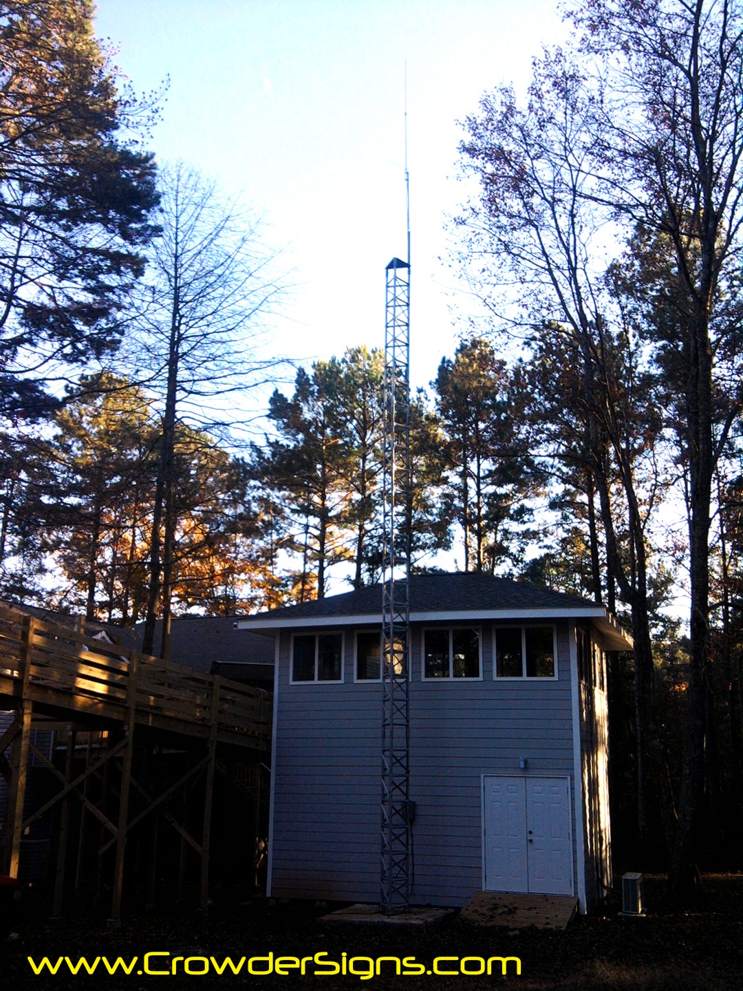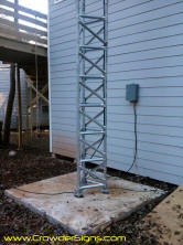 We have been installing and working on cell phone, municipal radio system towers, ham radio towers and more for decades. After many years of working with cranes, bucket trucks ladders and climbing structures so long it was a natural service for us to begin offering. We are an official dealer and installer for the American Tower Company and can get parts for other popular towers such as Rohn Tower. We also remove towers that need to come down for a myriad of reasons unless its just too big or unsafe without equipment we do not have access to but have only had one 160 foot tower the guy wires had been cut and the base was damaged we backed of on to date. The below tower installation was done with American Tower Company components and big enough footing for an 80 foot freestanding unit but owner felt 40 feet was enough once top section and mast brought center of antenna to over fifty-five feet. In our opinion 35 feet is enough for a starter tower, 50 to 60 feet work great and no need to go higher unless able to afford to make the jump to 90 or 100 feet..