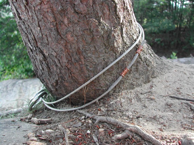 This type of anchor is easy to place, environmentally sound and removable without causing any permanent damage to anything. It saves much wear on a trees bark from continued rigging of webbing. It consists of two wraps of 5/16 inch stainless steel aircraft cable with two huge stainless rap rings. the cable is secured with two copper swages and is wrapped with an old piece of garden hose to protect the tree.