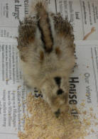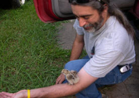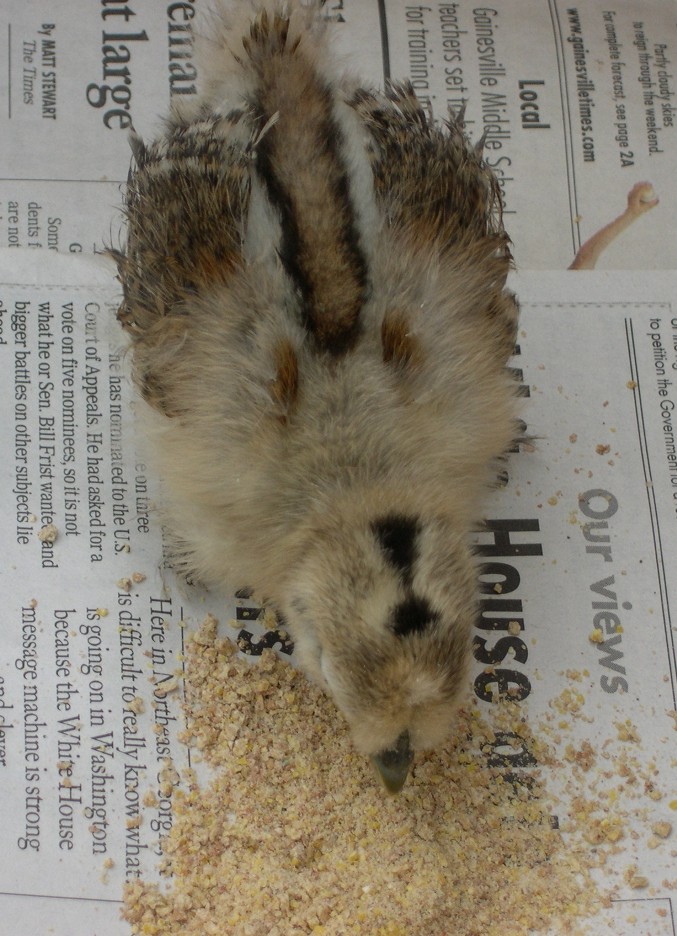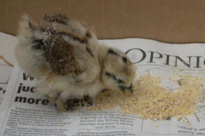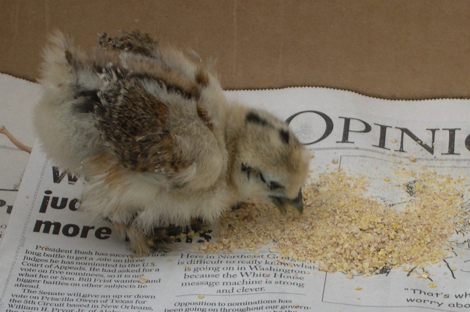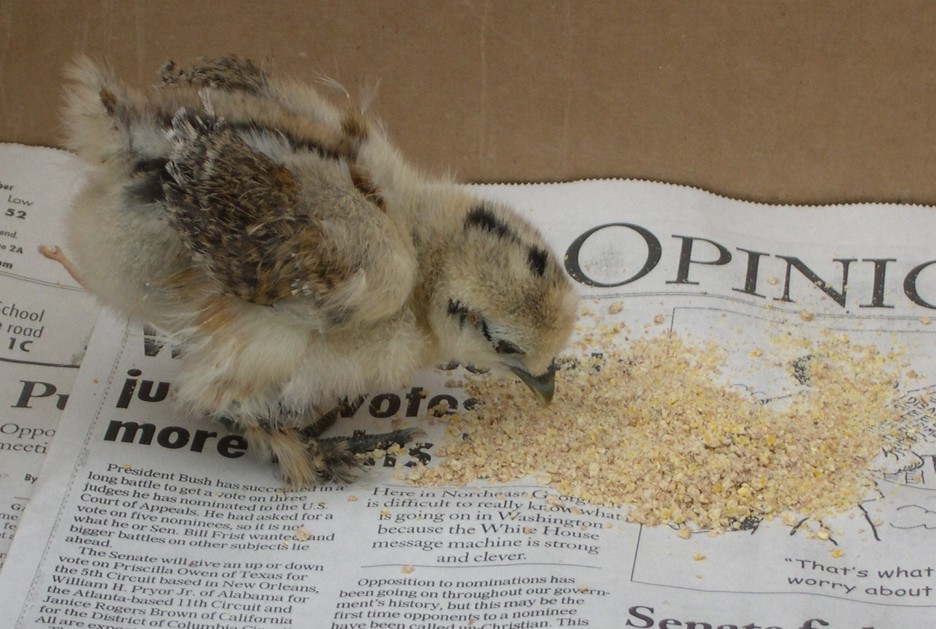 I got out of the truck and unlocked the shop and found an appropriately sized box. I pulled the lid off of a can of spray paint and filled it with water then went to the convenience store and bought a granola bar. After crumbling up the granola bar the chicken started eating and was content.