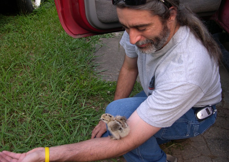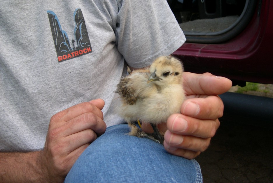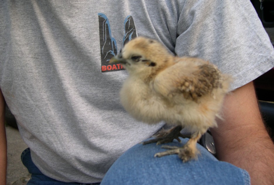 One day I was working in the shop minding my own business. I was sitting at my desk typing on the computer when all of a sudden this little baby chicken comes walking in the office and climbed up on the toe of my boot. As the day progressed it followed me around like a lost puppy dog. Every time I would come to a stop for a moment it would climb up on the toe of my boot and sit down like it belonged there. I thought this was pretty cute but kept working and made an effort not to step on the chicken.