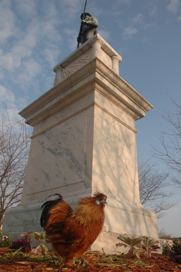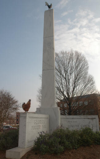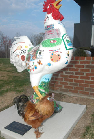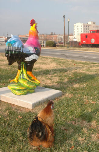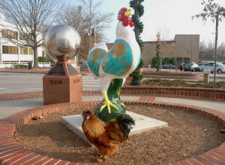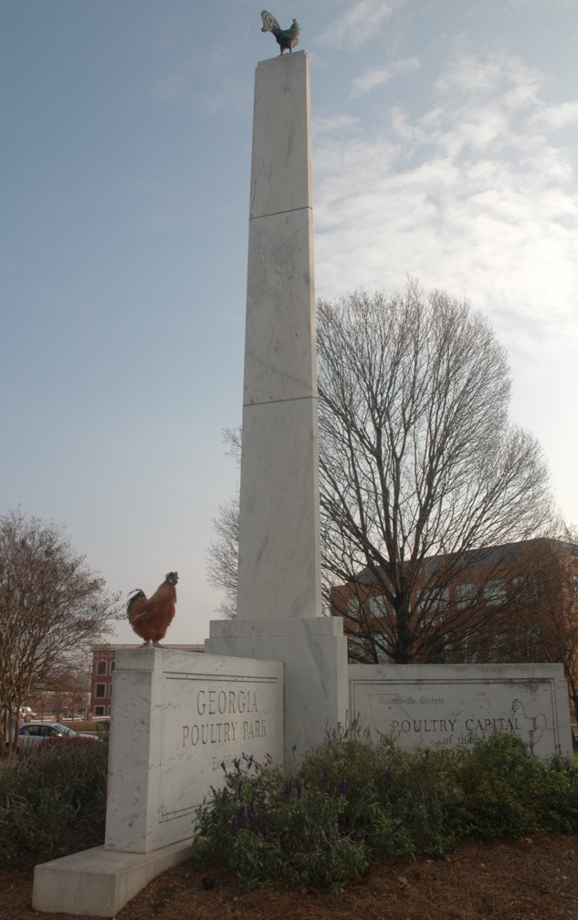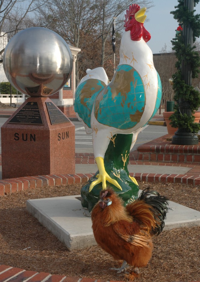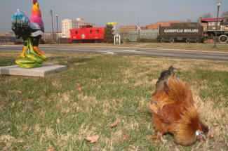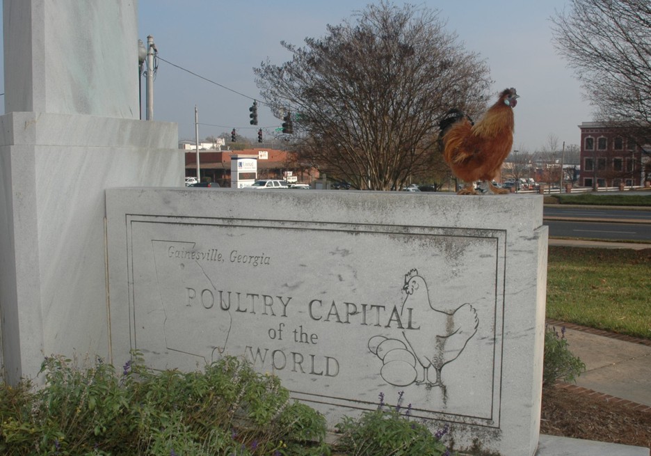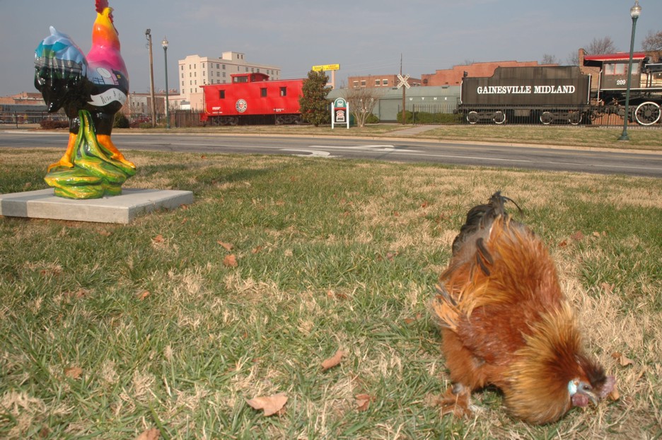 One of Chicken Little's favorite days is what we call Le Tour de Chicken. In the finest of French traditions, we set off on a power tour of Gainesville's different Chicken monuments. Believe me when I tell you that hitting all of the important chicken sites in this town is a long day for a hillbilly and his chicken. The only places we choose not to visit are the chicken processing plants that our town is famous for. These places are a real bummer for Chicken Little.