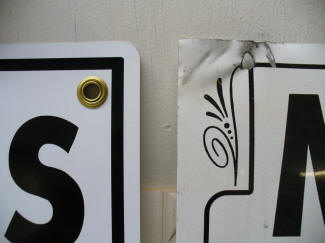 This company whose signs are pictured below, brought the sign on the right hand side of each photo, which was made by another vendor into the shop recently. They had three issues. First was the fact that the other company couldn't duplicate their logo with the proper turkey that they used in all of their other advertising and they couldn't do it in color. The next issue was that the signs were beating themselves to pieces in the mounting hole locations when they would swing in the wind. They didn't even know they had a square corner issue. Never let an aluminum sign out of your shop with square corners. It is non conforming to code and is dangerous to people, especially children, who end up in close proximity to the sign and may run into it.